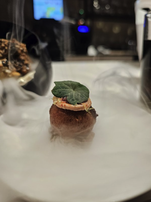 Su fuerza radica en el ángulo elegido, que no solo aporta dinamismo y profundidad, sino que realza la textura y los detalles del pintxo, convirtiéndolo en el protagonista absoluto de la escena. El equilibrio visual creado es impecable: el entorno se integra con sutileza, generando una atmósfera envolvente que potencia las ganas de darle un mordisco, despertando el deseo de degustarlo. Algo esencial en este reto gastronómico.